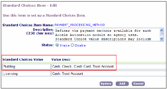 Configure this Standard Choice to display each module’s acceptable payment methods in the Payment Method drop‑down list. Specify the module in the Standard Choices value field and all acceptable payment methods in the Value Desc field.