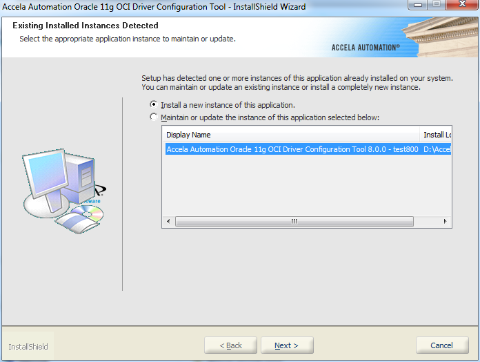 Only if the InstallShield Wizard detects that the Oracle 11g OCI driver configuration tool instance exists, the Existing Installed Instances Detected screen displays.