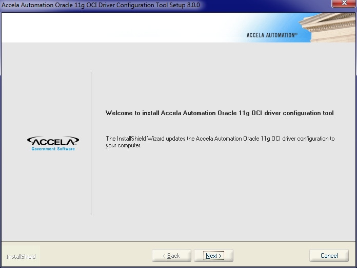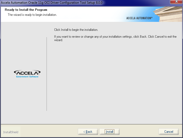 If some Civic Platform services are running, the installer stops the services, installs the OCI driver configuration tool, and then starts the services again when the installation is complete.