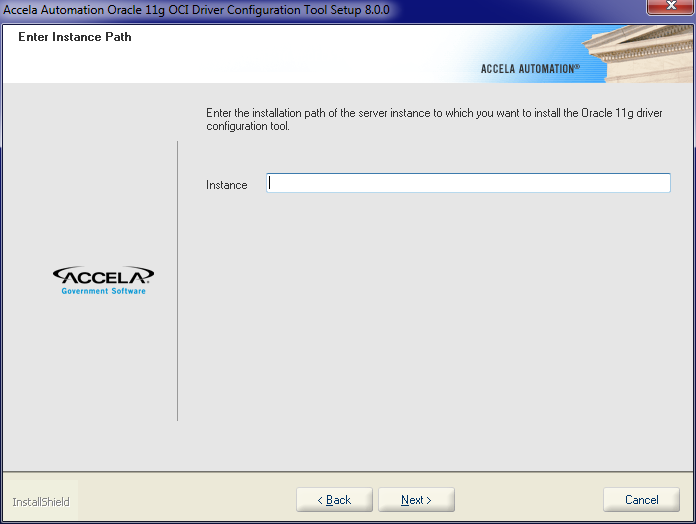 Note:If you installed a Civic Platform server instance remotely from the current machine to another one (for example, computer B), you must go to computer B to install the OCI driver configuration tool on the server instance. Because computer B does not store the installation path of the server instance, you need to enter the path manually.