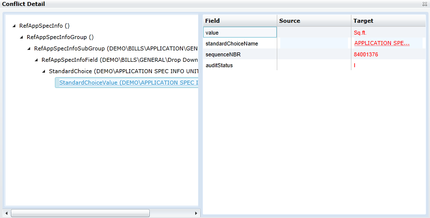 | D | Target. The value of the conflict item in the target agency. The value can be empty if undefined.The value shown in red is the one causing the conflict. |