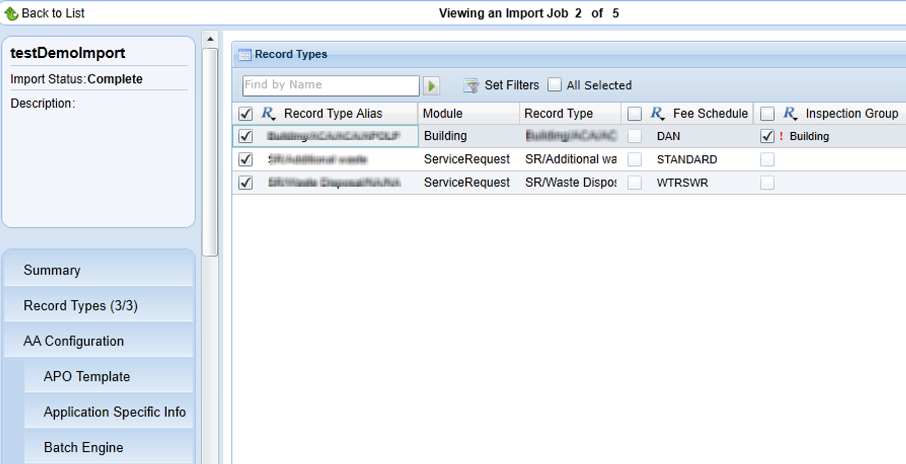 Click the type of data elements you want to include in the import job in the left navigation panel. For example, Record Types.