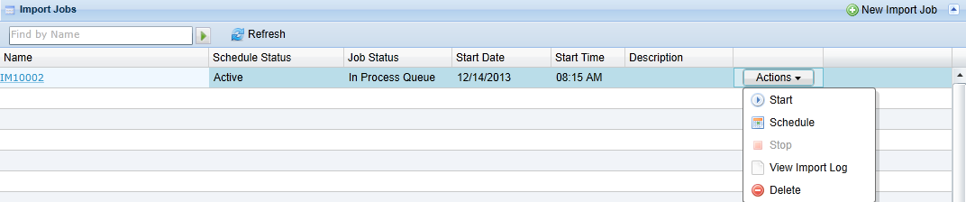 Use the import jobs Actions menu (see Figure 1) to manage and run import jobs. You can use the Actions menu to start and stop an import job, schedule an import job, view a log of all the changes made to an import job, and delete an import job.
