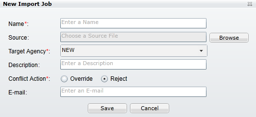 Conflict Action Choose from two options, Override and Reject. These options refer to conflict data between the target agency and source agency. If you want the data elements in the import file to overwrite existing duplicate data at the target agency, select the Override option. If you do not want the data elements in the import file to overwrite existing duplicate data at the target agency, select the Reject option. Note:The value you select for this field determines the default conflict action for all the conflict data elements. You can open the import job configuration page and select different conflict action for specific data elements.