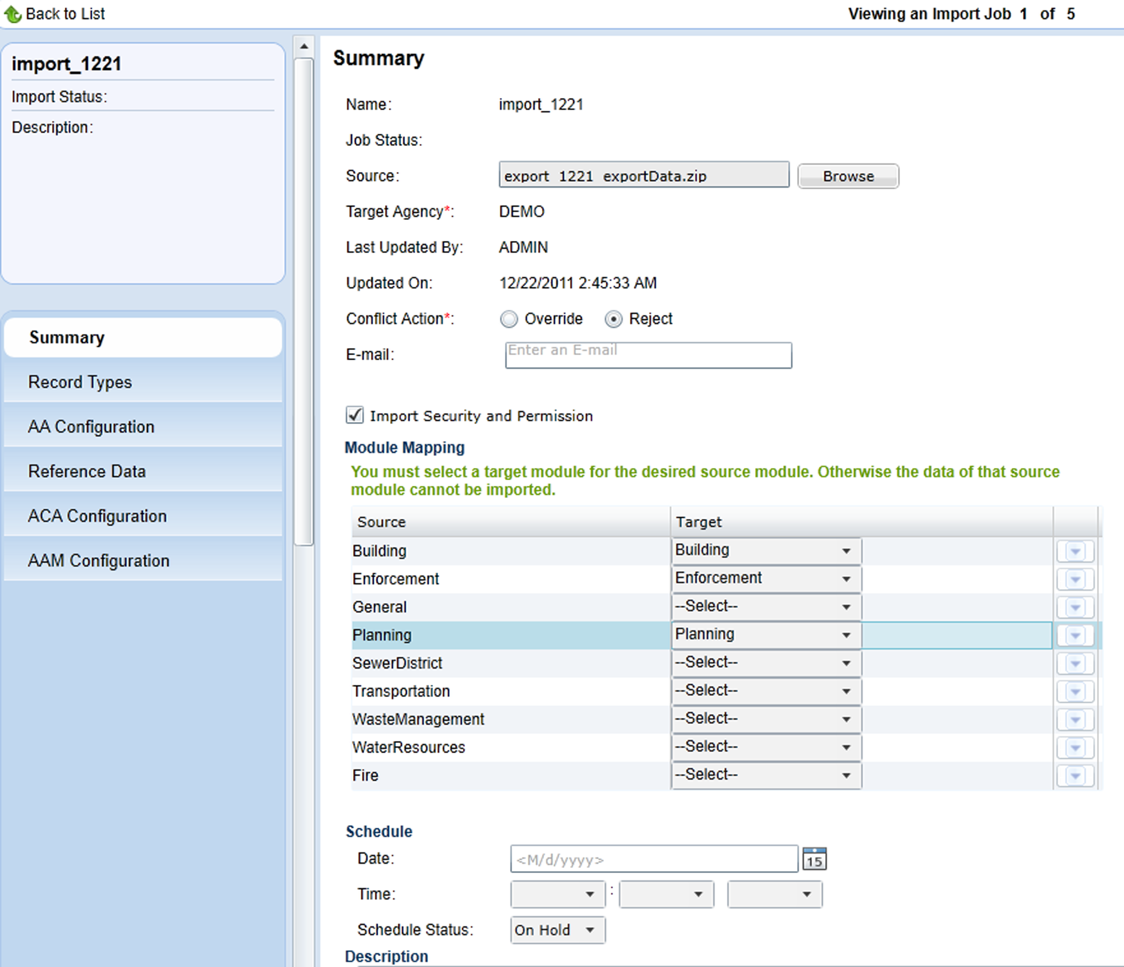 Your configuration can associate security and permission settings with data elements at the module level or user group level. The import job summary page displays the security and permission setting and their module mapping (Figure 2). You can choose whether to import security and permission from the source agency, and specify how to map the modules and user groups in the source file to the modules and user groups in the target agency.