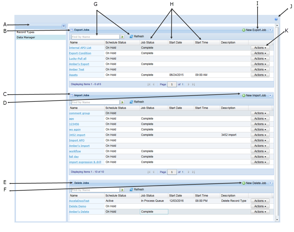 | D | New Import Job. Click this button to create a new import job, or click the down arrow beside the button to expand or fold the existing import jobs. |