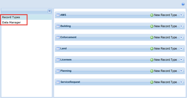 Civic Platform displays the Record Type Administration and Data Manager links in the navigation panel on the left.