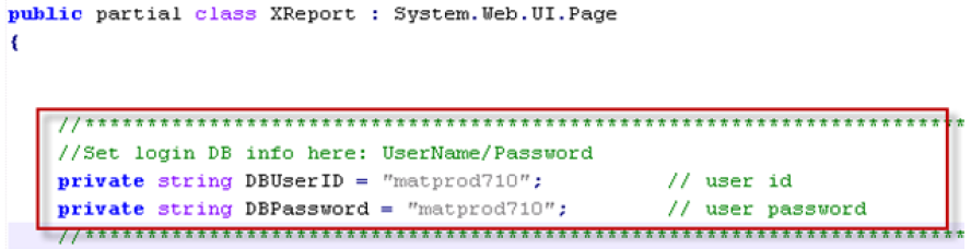 Open the XReport.aspx.cs file in the /adapter folder from the cr2008_embedded_v2&v3.zip package. Enter the username and password that for the Oracle or SQL database connection configuration. The following image shows the code snippet.