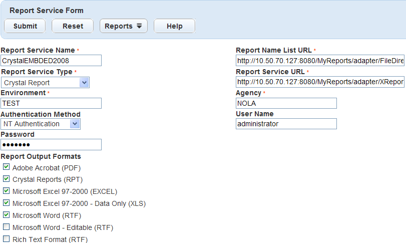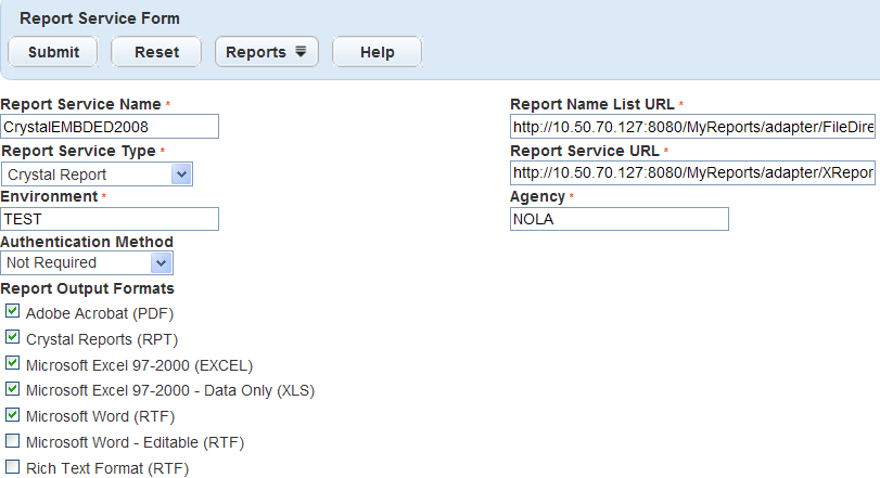 Report Name List URL http://< Crystal Report server IP address>/myreports/adapter/FieldDirectory.asp Report Service URL http://<Crystal Report server IP address>/myreports/adapter/XReport.aspx Report Service Type Select Crystal Report. Authentication Method Select Basic Authentication. User Name and Password the login name and the password of the Crystal Report Server.