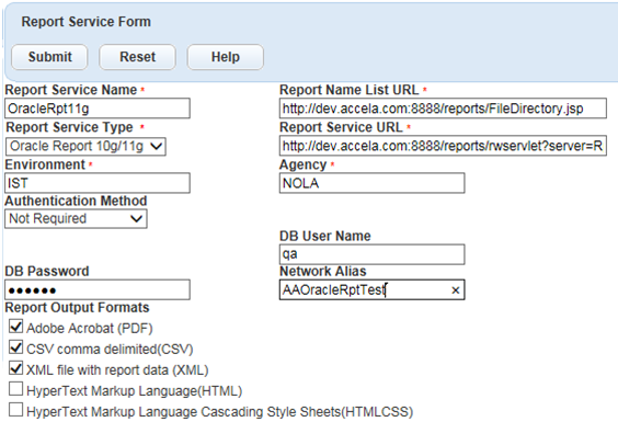 Agency The agency name. This can be a second-level subfolder containing Civic Platform reports under CP_OracleReport. See Deploy Oracle Reports and Relevant Files. Environment The agency environment name. This name can be used as first-level subfolder containing Civic Platform reports under CP_OracleReport. See Deploy Oracle Reports and Relevant Files. Network Alias The name of the Oracle service, as defined in tnsnames.ora. Report Service Name The name of the report service. Report Name List URL http://<web_server.domain_name:port>/reports/FileDirectory.jsp Report Service Type Oracle Reports 11g. Report Service URL http://<web_server.domain_name:port>/reports /rwservlet?server=<report-server-name>&destype=cache&desformat=pdf Tip: View the report server name on the menu item. Example: