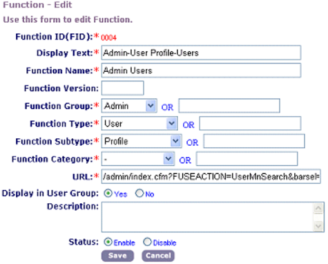 Display Text The function title. Function Name A short description of the function. Function Version The function release version. Function Group Whether the function is an administrator, daily, or reporting function. Function Type The major feature that the function supports (typically the main-level menus that appear throughout Civic Platform, such as Application or Workflow). Function Subtype A more specialized function within the function type. Function Category A specialized function within a function subtype (used very infrequently as most functions fit within three levels). URL The address of the page containing the function. Civic Platform calls this URL for the function. Display in User Group Whether the function is visible to general users. Description Any comments about the function. Status The enabled or disabled status.