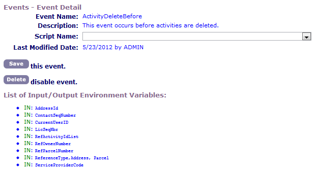 Other possible events include finding a record, assessing a fee, scheduling an inspection, and so forth. Civic Platform provides more than 200 events with which you can associate scripts. You cannot create new events, but you can choose the events to set up for your agency and disable the events that you do not use.