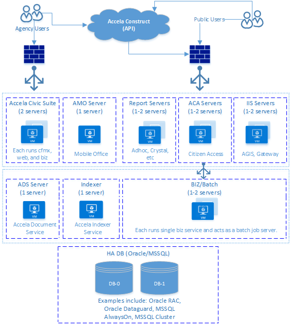 - For a medium-size agency, use a separate host for the Citizen Access server and Accela Gateway, and a separate host for the Mobile Office server and Accela IVR server as shown in the topology diagram.