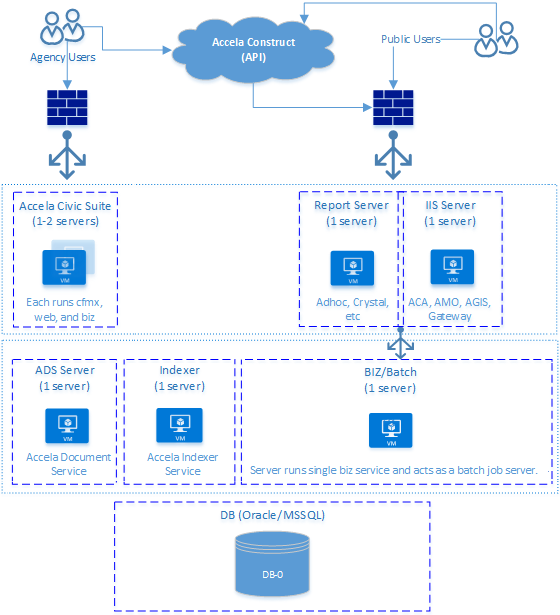 This small-size deployment topology diagram shows a sample consolidated deployment for agencies with less than 50 named users. In this configuration, the Citizen Access server, Accela Gateway, Mobile Office server, and Accela IVR server reside on a single host in the DMZ. The Civic Platform application server and web server reside on the same host. An additional Civic Platform application server handles request load and response load from the DMZ-hosted servers.