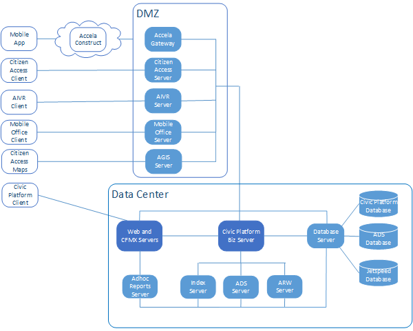 Civic Platform provides the core functionality for the system. The Civic Platform web server receives instructions to construct and deliver web pages to a Civic Platform browser-based client, and provides information from the browser-based client to the application server for processing. The ColdFusion MX web server provides the user interface environment for the Civic Platform Classic administrative tool.