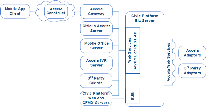 Accela client products and third-party products integrate with the Civic Platform application server through the Accela GovXML API, the Accela REST API, one of many provided web services, or a pre-built adapter. The image below illustrates these interfaces. GovXML uses an XML based request and response paradigm, and an HTTP based service, that communicates with the Civic Platform application server. Accela external web services use a standard request/response web service architecture. The web and CFMX servers also invoke Enterprise Java Beans (EJBs) on the Civic Platform application server.