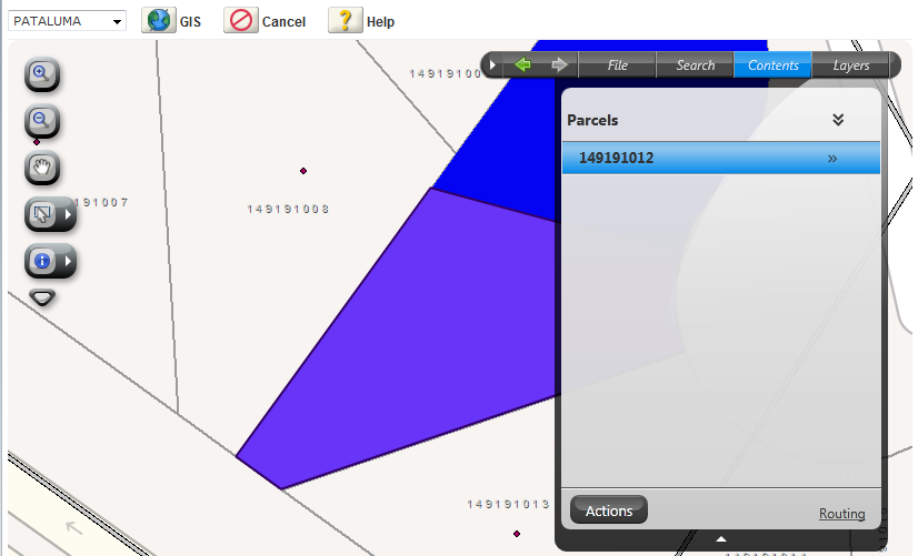 Accela GIS displays a map overlay or icon on the selected object. The object also displays in the Contents panel.