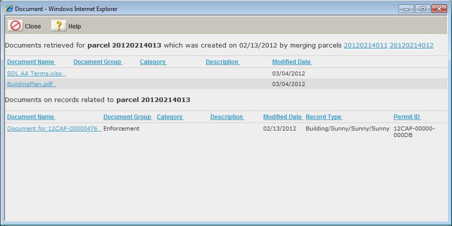 Accela GIS displays a Document window listing attachments associated with the current parcel, as well as attachments associated with the records related to the current parcel. If the current parcel was generated by splitting or merging historical parcels, the historical parcel numbers are listed in the window. You can click these parcel numbers to view the attachments associated with the historical parcels.