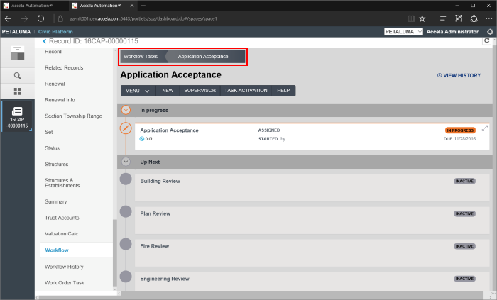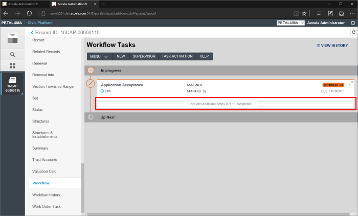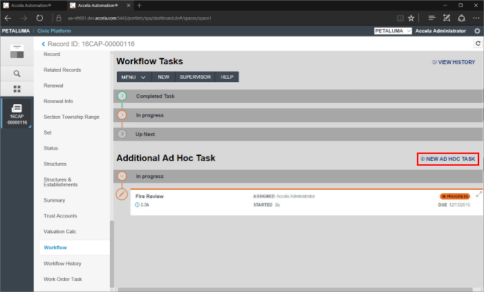 Civic Platform opens the record for which the task is needed, and displays the Workflow tab with the selected task details displayed.