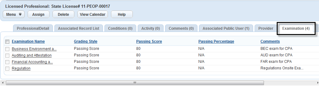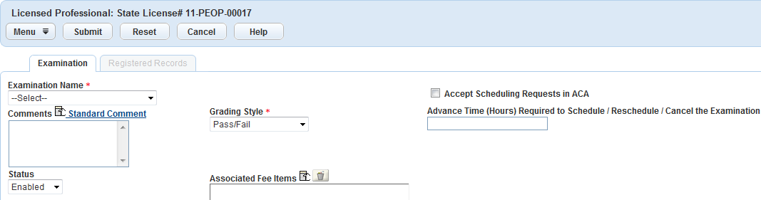 You can assign an examination subject to an examination provider in the provider (licensed professional) record. Some agencies choose set up and associate examination providers and examinations so that they are available for users to select. See “Associating an Examination Subject with Examination Providers” in the Accela Civic Platform Administrator Guide for more information