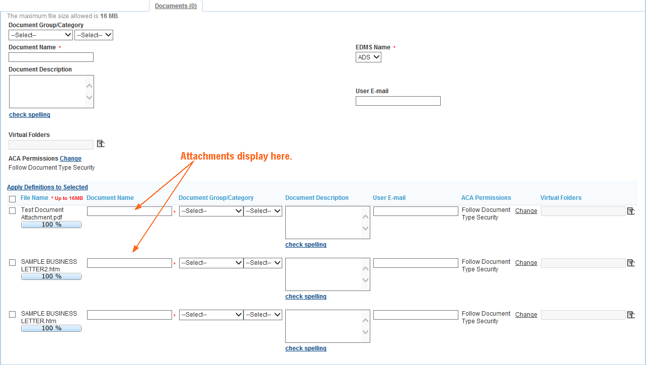 Civic Platform saves the attachments along with any applied attributes/definitions to the selected record. The newly uploaded attachments appear on the Documents tab.