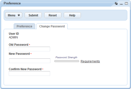 Old Password Enter your current password. New Password Enter a new password that meets your agency’s security requirements. Use the Requirements link to the right of the password strength indicator to view your agency’s minimum password requirements. Confirm New Password Re-enter your new password to confirm it. Click Submit.