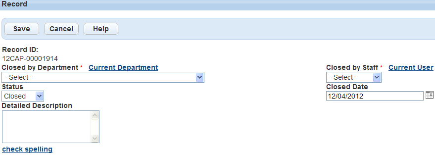 When you complete the records such as finish the tasks or work orders, or appraise the record is unworthy of tracking, you can close the record where you record the responsible party, status, closed date and detailed description.