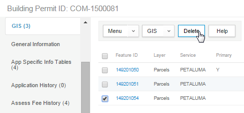 From the list of map features on the GIS section, select the Feature ID you want to delete, and click Delete: