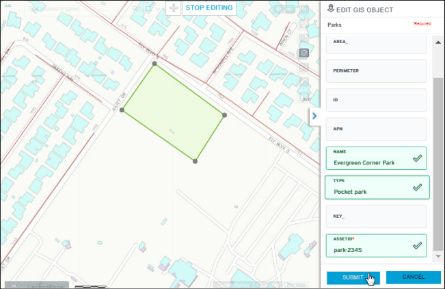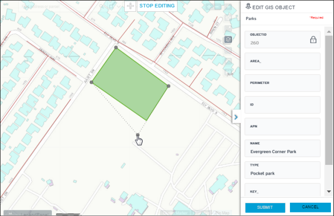 layer session and view the modified GIS object on the map, along with other mapNote: If STOP EDITING is clicked without submitting the last GIS object data entry or drawing, the user will be prompted to discard any changes or to resume the edit layer session.