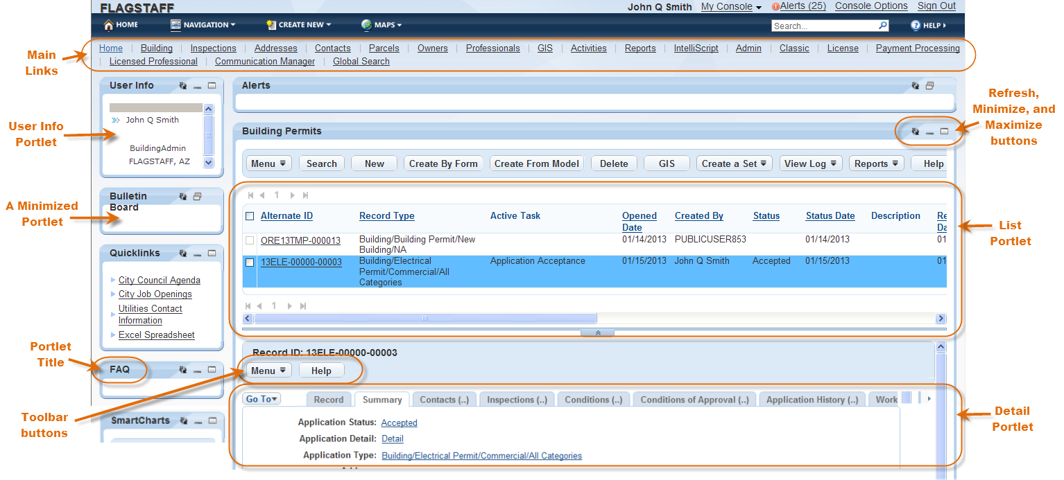 The console refers to the entire working area of your browser that comprises Civic Platform. The console includes an agency bar, toolbars, main links, portlets, record tabs, and detail forms. The console lets you interact with Civic Platform and its add-ons by clicking the main links and working in associated portlets. The following figure shows an example of a console and its associated parts.