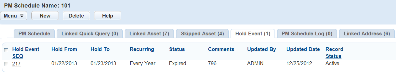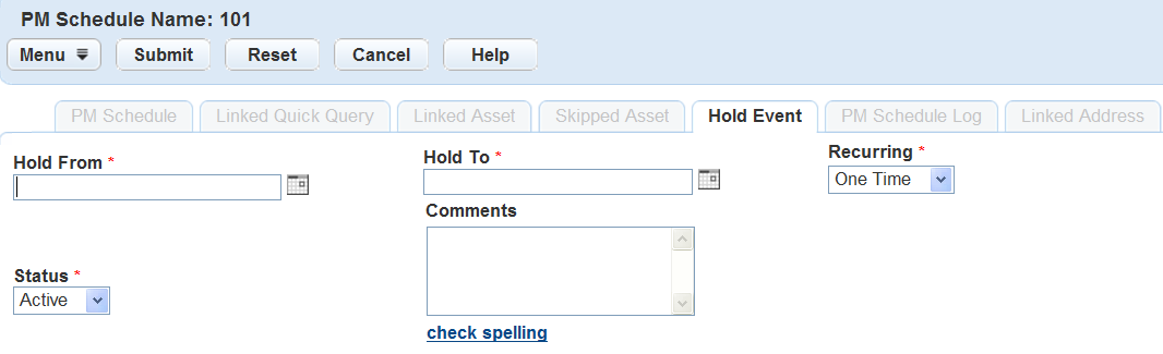 Enter the Hold From and Hold To dates to indicate when the PM schedule should not execute.