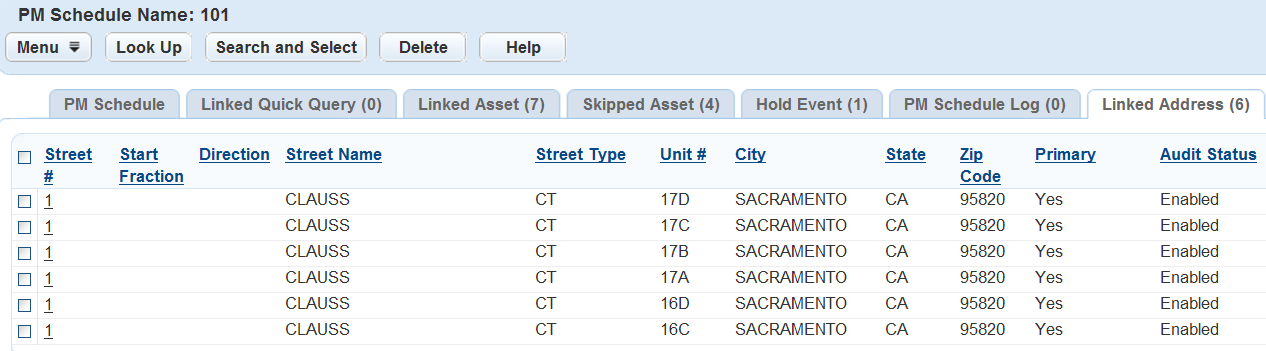 You can link a PM schedule to one or more street addresses as needed. For example, you can create a PM schedule for a series of property inspections, linking the schedule to a group of property addresses rather than to a group of assets.