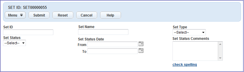 Access the Set details portlet either by clicking the Set link in the Main Links section at the top of your console or by clicking the Set tab on the record detail portlet.