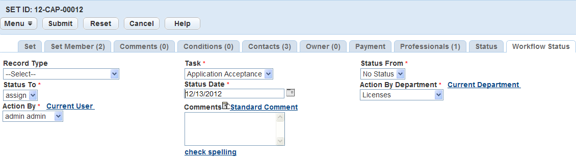 An agency administrator must enable this feature (see 8364-Set Status Change in the Civic Platform Configuration Reference for more information about configuring FIDs). |