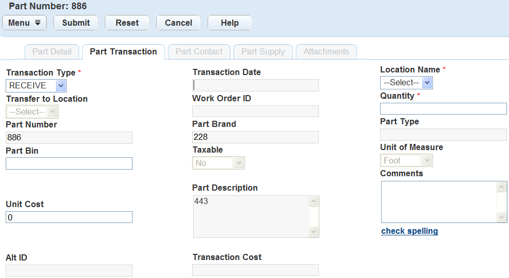 There are five part transaction types. Different fields display, depending on which part transaction type you choose to create.