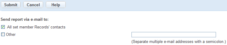 All set member Records’ contacts This sends the report via email to all contacts associated with each record in the audit set. Other This sends the report via email to recipients you designate. Enter email addresses in the provided textbox. Separate email addresses with a semicolon. Click Submit.