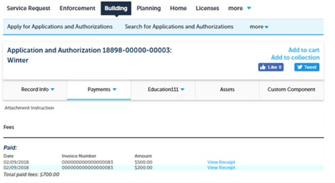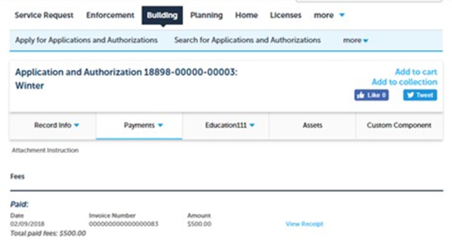 - Using Citizen Access, pay fees (the example below shows 2 fees paid).