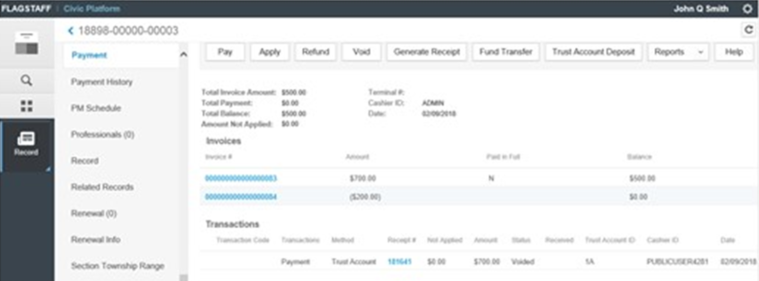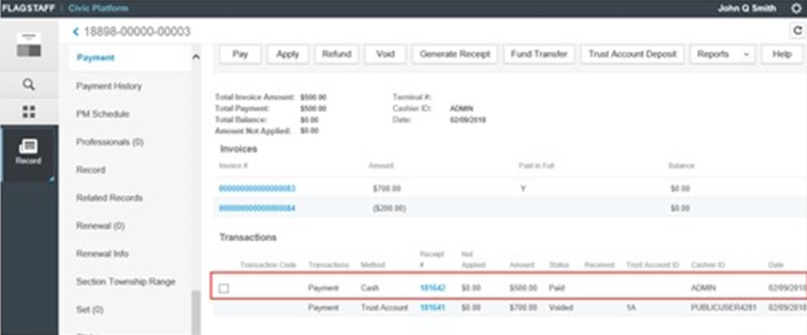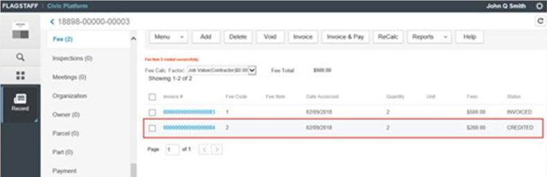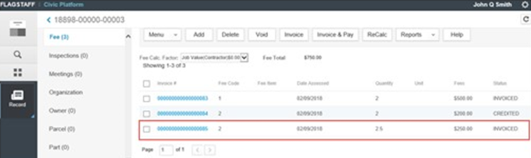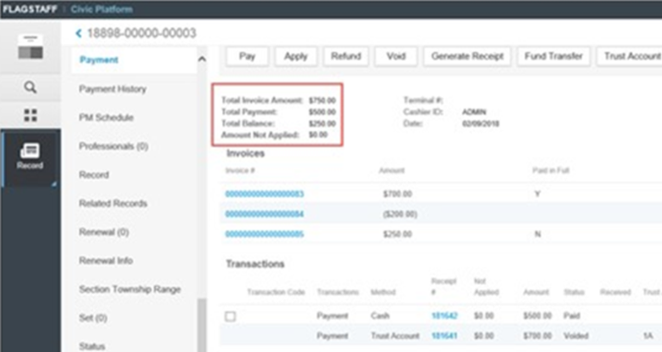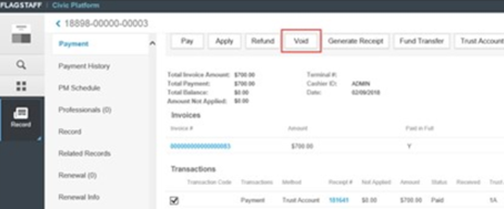 If you decide you want to take a few steps back, you must void the invoice, and then you can void and replace the assessment and put it on a new invoice. Civic Platform credits back the original payment to the customer. Civic Platform does not apply or attach the payment to anything, which allows you to take this payment and apply it to another invoice.