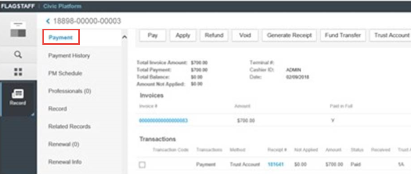 A customer has the ability to make a payment to the agency at any time. After you receive a payment, Civic Platform applies it to one or more applicable invoices and/or applications. If you have assessed and invoiced a fee, but you are still waiting for a payment, you have a couple of options