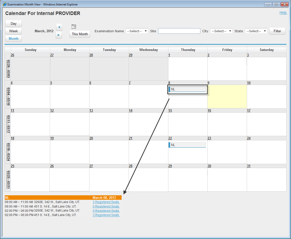 Use the examination calendar to review exam information for a provider in daily, weekly, and monthly view modes. In the selected mode, you can click an exam item to see the exam sessions and the number of registrants for each exam session. See Scheduling an Examination to learn how to schedule examinations for an examination subject.