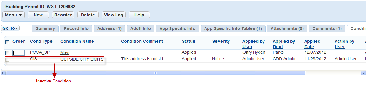 When you delete a condition from a record, the condition becomes inactive, but remains in the condition list. You can view this inactive condition by clicking the Condition Name link, but you cannot edit the detail page of it. For information about deleting a condition, see Editing or Deleting an Existing Condition.