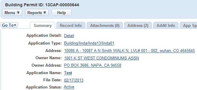 Users can view a customized Summary page as needed. Each section of the summary addresses an application area. Sections include a brief summary, field information, and a hyperlink that takes you to the associated area portlets in Civic Platform.