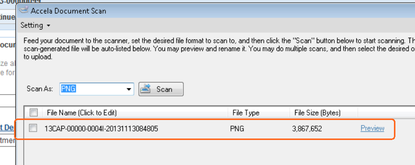 When the scan is complete, the scanned document file appears in the File Name list on the Accela Document Scan window.