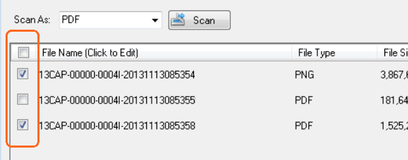 When you finish scanning documents, select the document files you want to upload to Civic Platform. You can select all files by marking the check box in the title bar (next to File Name).