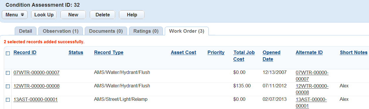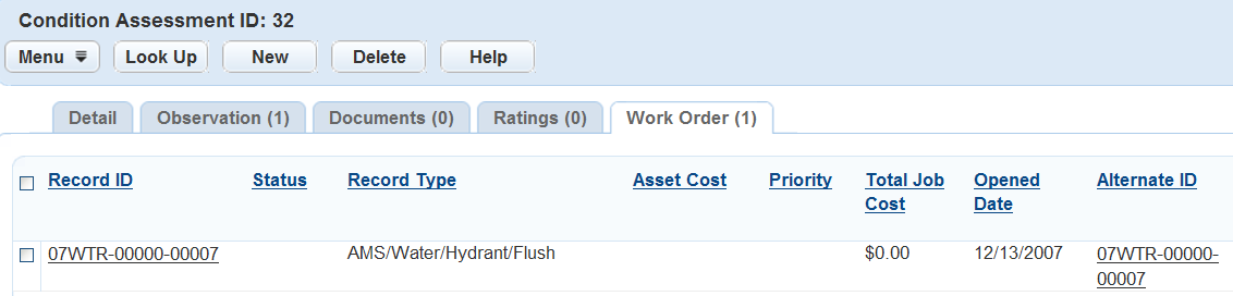 Click the Condition Assessment ID link for the assessment to which you want to link a work order.