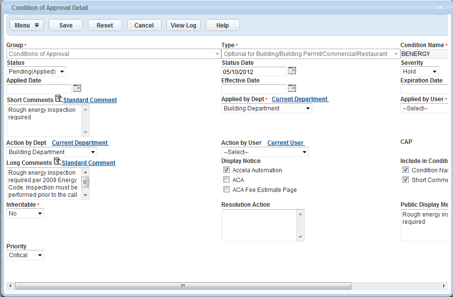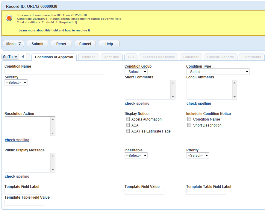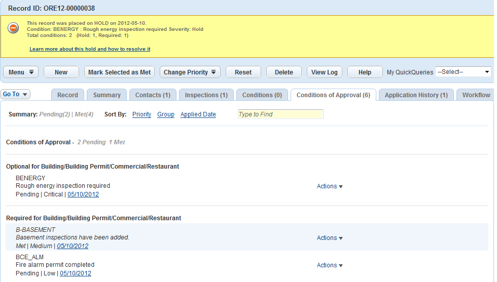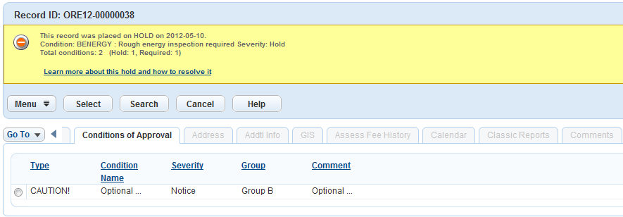 Use conditions of approval to define a list of requirements to be met before an applicant receives approval for a permit or an inspection. Generally, Civic Platform applies conditions of approval to records, inspections, or set members in a record set. The process of working with conditions of approval is very similar for records, inspections, and record set members. The only difference is the starting portlet. Besides, the Conditions of Approval tab for a record or a record set displays the conditions of approval applied to the record or the set members and those applied to the inspections associated with the record or the set members. The Conditions of Approval tab for an inspection only displays the conditions of approval applied to the inspection itself. The following topics use records as an example. You can, however, also follow the topics to manage the conditions of approval for inspections and record set members.