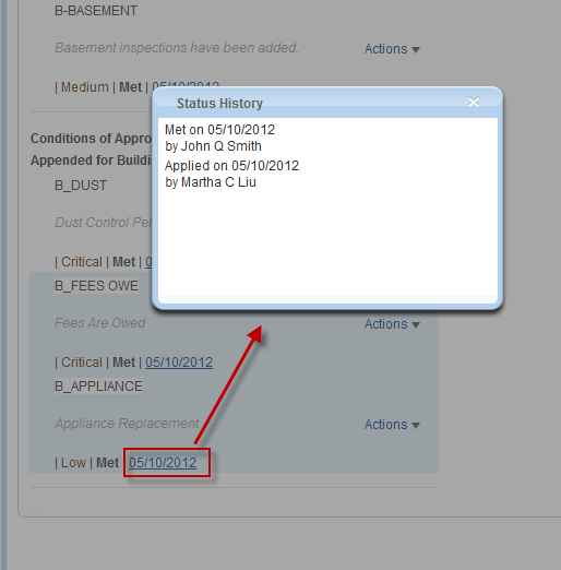 You can view the details and status history of a condition of approval from the Conditions of Approval tab.
