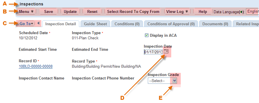 | A | Portlet title. Indicates the current portlet and displays the record number you are working with. |