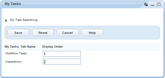 When the My Tasks portlet displays more than one tab, you can define which tab displays on top by default. For example, if you prefer to view your inspection workload first, you can set the display order to display the Inspections tab by default whenever you open the My Tasks portlet.