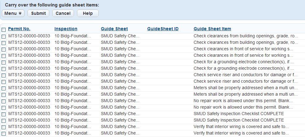If someone canceled, rescheduled, or completed an inspection of the same type in the application, and the inspection contained failed checklist items which are still hanging, Civic Platform displays the Carryover checklist items page.